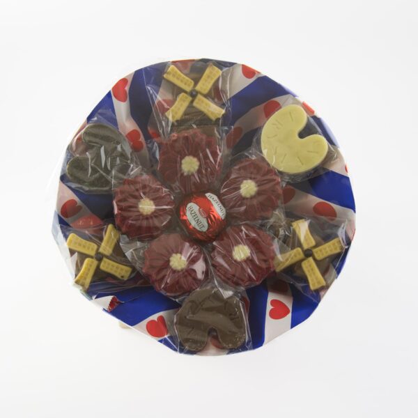 Onze boeketten van chocolade zijn handgemaakt en bevatten de heerlijkste chocolaatjes in de vorm van typisch Friese items . In ons assortiment vind je één variant van dit boeket. Wanneer je een grote variant zou willen bestellen, vraag er dan gerust naar. We maken dit graag voor je!