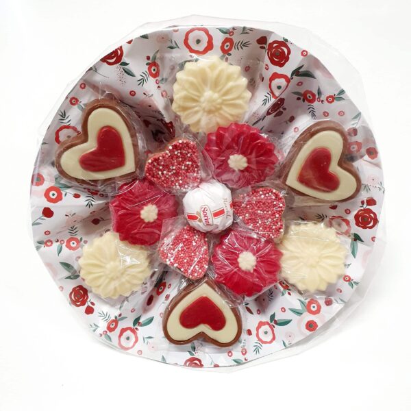 “Liefde is net als chocola, je kunt er nooit genoeg van krijgen”. Dit is helemaal van toepassing op dit mooie boeket. Een lief gebaar in rood. De chocoladebol is het hart van het boeket. Daaromheen zitten rode en/of witten bloemen, drie kleuren melkchocolade harten, staniol/ musket melkchocolade hartjes en drie stuks merci chocolade. Het papier is uiteraard in stijl, zodat je aankomt met een exclusief Moederdag cadeau.